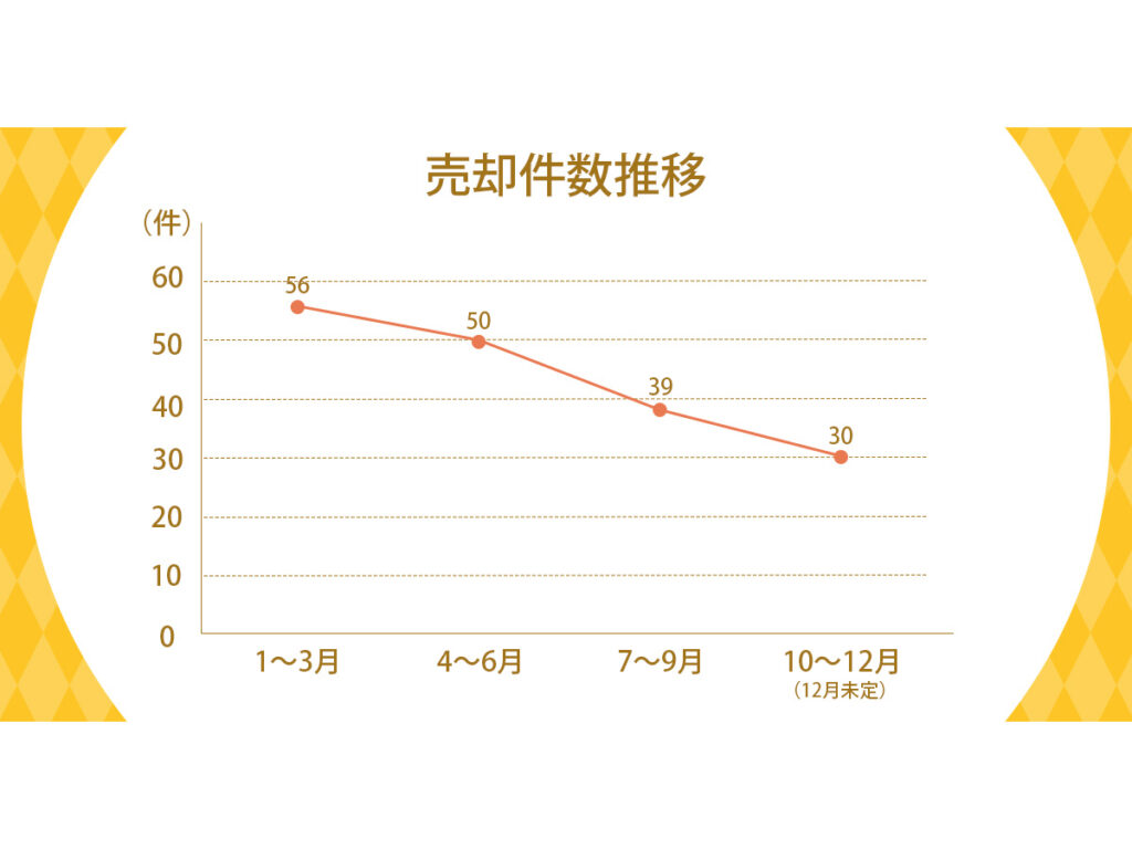 2025年の売却件数は四半期ごとに変動が見られ、1〜3月は計56件、4〜6月は50件と堅調に推移しました。7〜9月は39件とやや落ち着きましたが、11月には19件と再び増加傾向が見られます。