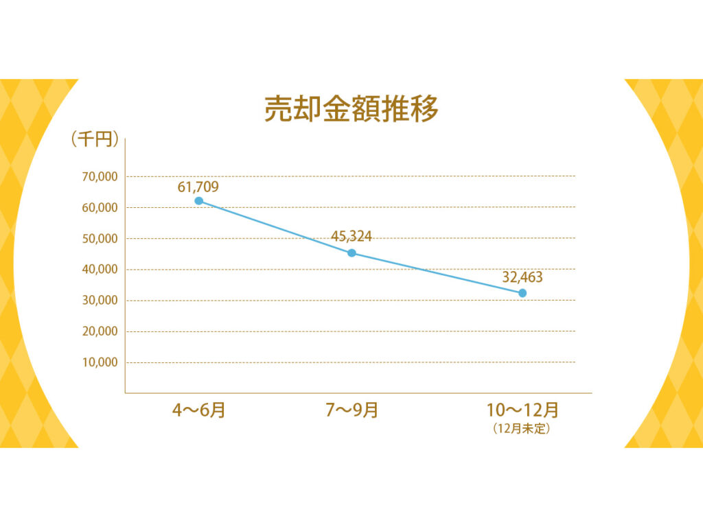 買取金額の推移を見ると、4月の23,528千円、5月の17,693千円、6月の20,488千円と、春先に高額案件が集中する傾向が確認できます。7〜9月は12,558〜13,818千円と落ち着いた水準で推移し、秋の10月には23,896千円と再び上昇しました。